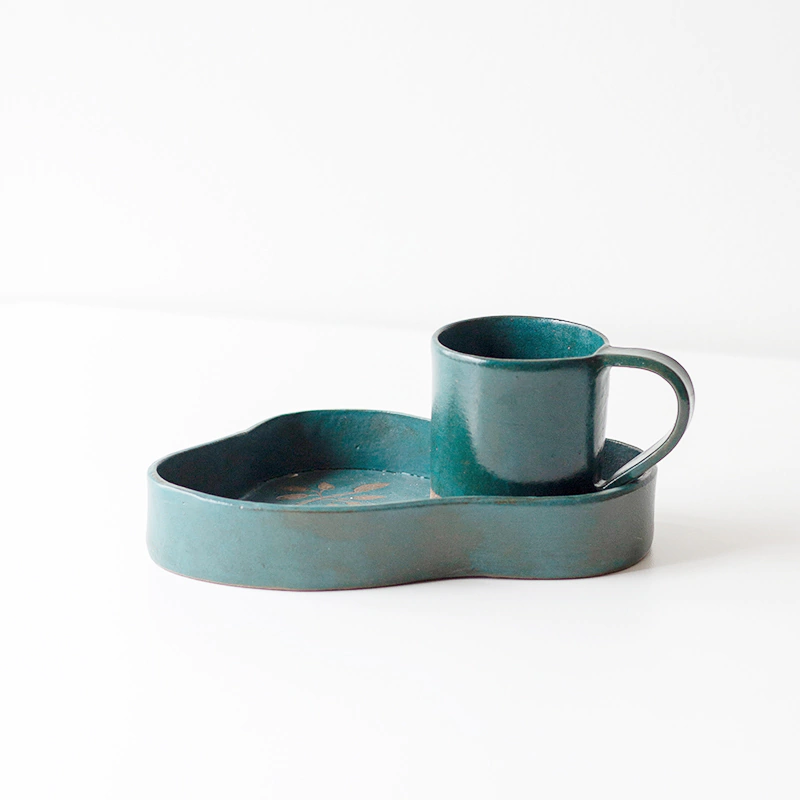 01 Xícara na cor esmeralda. Acompanha 01 pires com detalhe de folha. Confira nas últimas fotos a combinação entre as cores esmeralda e turquesa. Peça feita à mão, em cerâmica, de maneira artesanal.